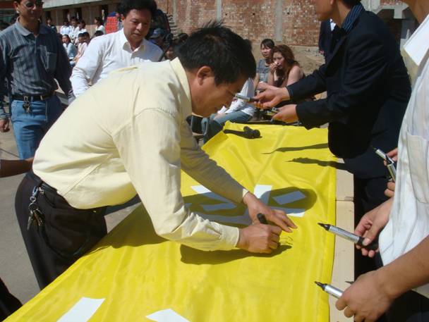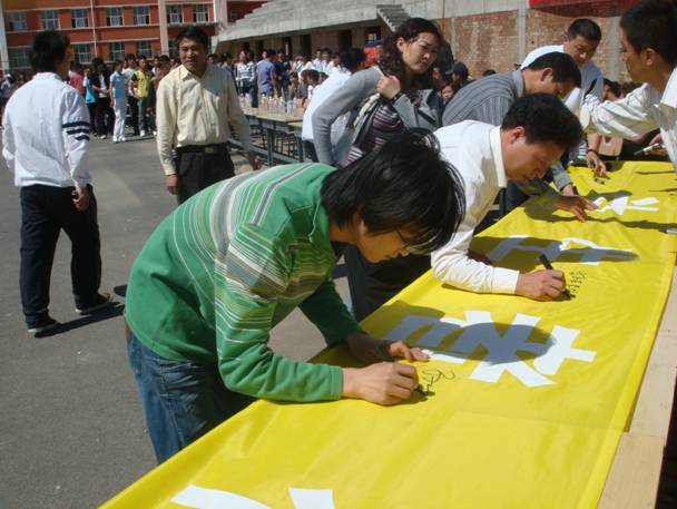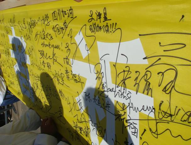 本次活动特邀张家口电视台、张家口晚报进行宣传报道。学院领导和高新区民政局有关领导亲临活动现场,陈院长代表学院讲话并带领全体人员向5.12大地震受难同胞表示哀悼,同时对广大学生提出了殷切的希望和明确的要求。活动中还邀请到震后由我市大北车行安排就业的三十名来自四川德阳灾区的受灾同胞,他们与我系学生共同表演了《感恩的心》,并接受了万象城官网和高新区民政局共同捐赠的慰问品,灾区同胞因此倍感温暖。随之,在《让世界充满爱》的音乐声中开始了“为生者祈福、为逝者哀悼”万人签名活动,由全校师生在长卷上献出自己的爱心,送上自己对灾区人民的祝福。