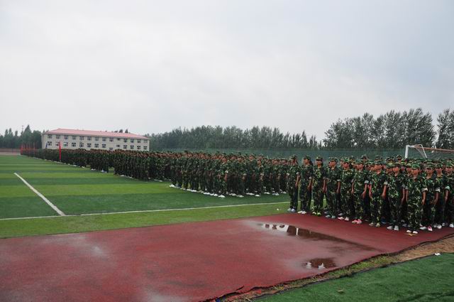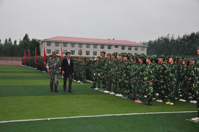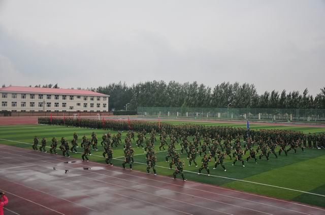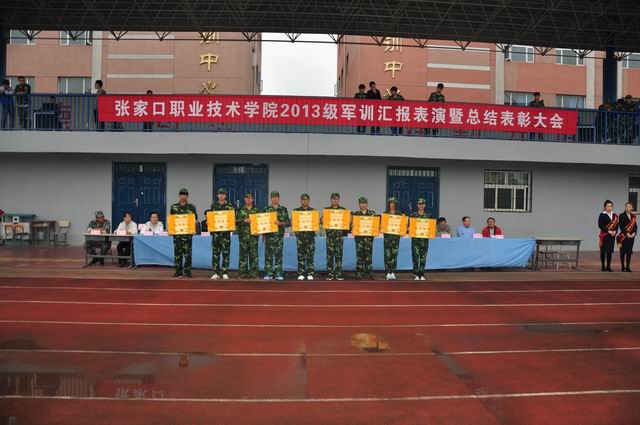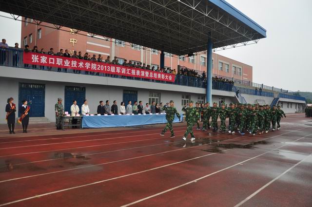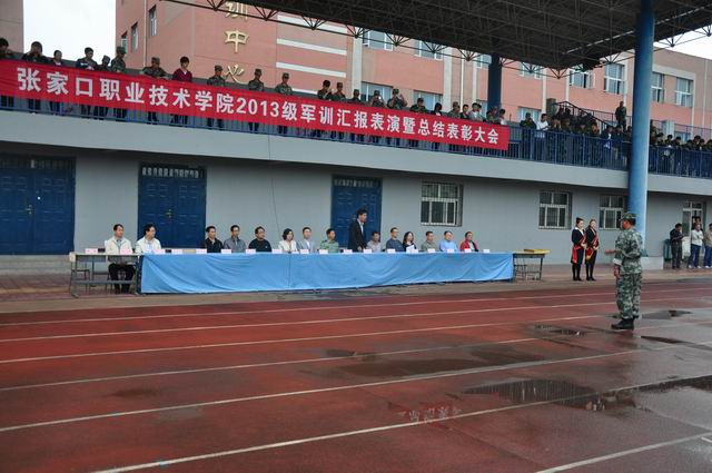9 月18日上午9时,伴随着庄严雄壮的国歌声,万象城官网2013级新生军训汇报表演暨总结表彰大会在体育场隆重举行。党委书记胡炜、院长王立秋、纪委书记史慧武出席大会,各系书记、团总支书记、新生辅导员及学院军训领导小组全体成员参加了大会,张家口军分区军训办参谋翟民伟应邀到会。大会由史慧武主持。
