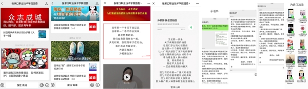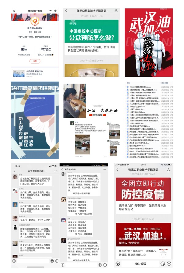 面对新型冠状病毒引发的肺炎疫情,学院共青团组织在党委的坚强领导下,积极贯彻党中央决策部署,认真落实上级团组织要求和学院疫情防控工作安排,在宣传动员、舆情引导、志愿服务等方面发挥优势,引导广大团员青年在假期中争当防疫“宣传员”和后勤“保障员”,志愿参加所在区域防疫工作,锤炼意志品行,努力提升自我,积极展现张职院青年生力军和突击队的作为,在疫情防控工作中筑起了青春战疫的长城,贡献出张职院学子的一份力量。