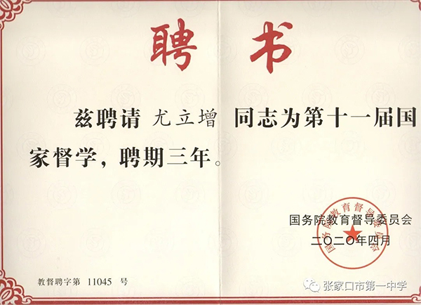 日前,国务院教育督导委员会办公室印发了《关于聘任第十一届国家督学的通知》,根据《教育督导条例》《国家督学聘任管理办法(暂行)》和教育督导工作需要,经地方推荐、教育部审定和公示,万象城官网特聘导师、张家口市第一中学教师尤立增被聘为国家督学,聘期3年。
