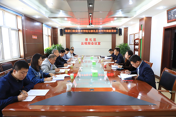 冯莉群主持座谈,常务副院长李炜杰、学院相关系部负责人、崇礼区政府及相关企业负责同志陪同考察调研。