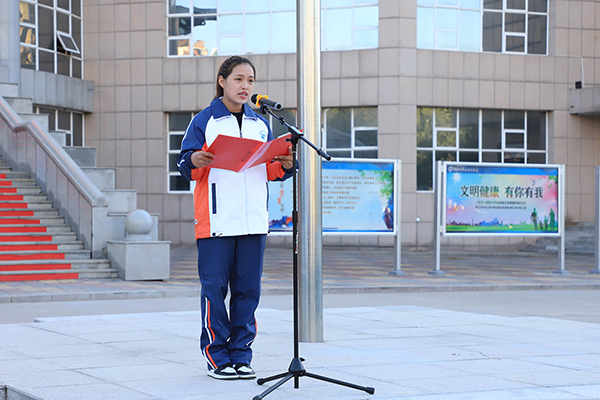 清晨7时15分,在综合行政楼前广场,由9名学生组成的国旗护卫队迈着铿锵有力的步伐护卫国旗步入会场。伴随着雄壮的国歌,在全体师生的注目致礼中,鲜红的五星红旗徐徐升至杆顶,迎风飘扬。
