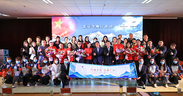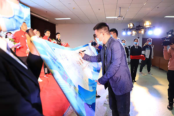 宣讲结束后,出席领导、嘉宾与现场师生共同在印有“燃动青春 助力冬奥”主题的卷轴上签名、留言,表达对北京冬奥会的期待与祝愿。