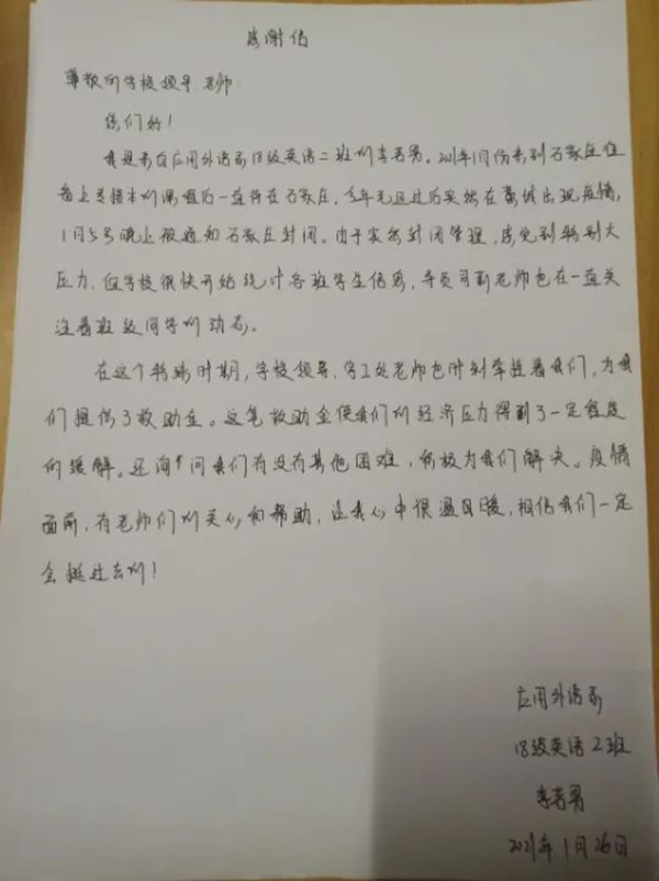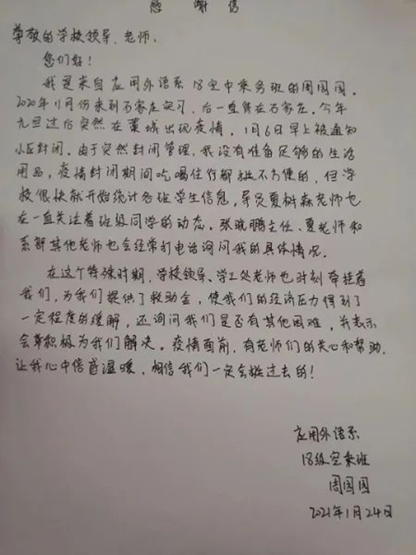 目前,万象城官网滞留石家庄的105名学生心理与思想稳定,生活无忧,大家对学院各级给予的关心关爱表示感谢,对战胜疫情充满信心。同时,学院也将持续关注滞留学生的身心健康和生活情况,继续开展有温度、有力度、有深度的帮扶活动,全力帮助学生们顺利渡过难关,共同打赢疫情歼灭战。