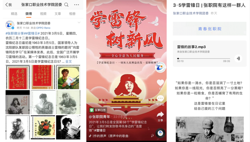 3月5日,学院广播台录制《“3.5学雷锋日”特别栏目》,团委微信公众号、微博、抖音发布“践行雷锋精神 献礼建党百年”主题教育活动,引导广大团员青年积极践行雷锋精神,传递青春正能量。