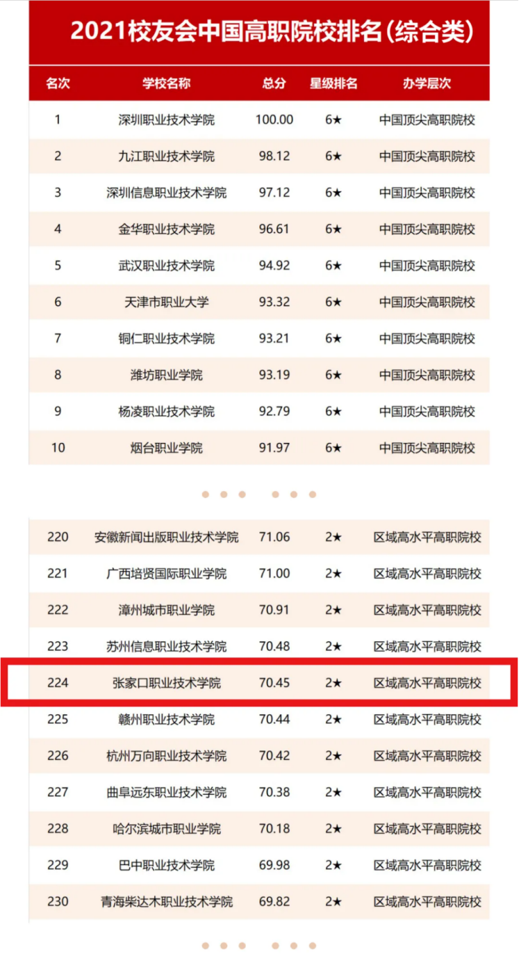 万象城娱乐awc线路在2021校友会中国综合类高职院校排名位列第224位。