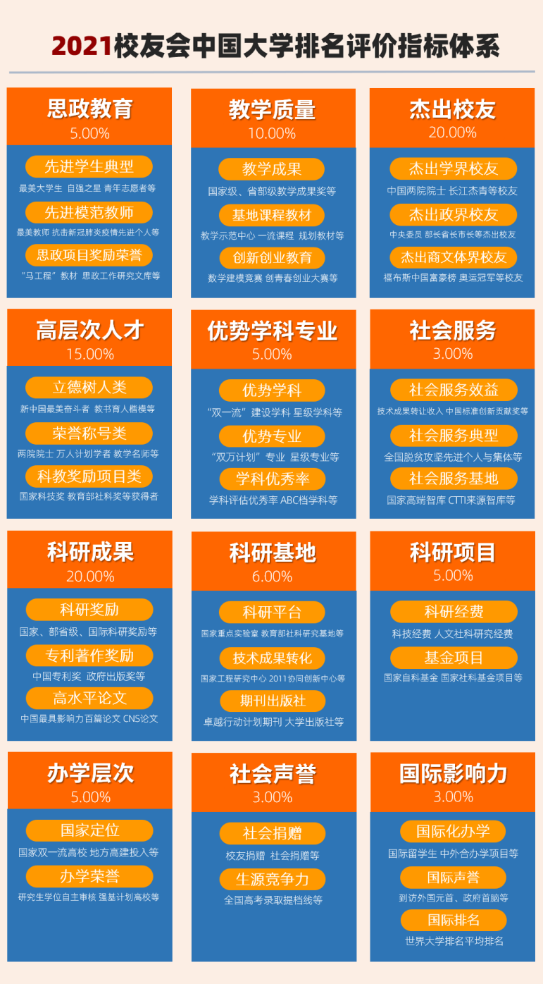 校友会2021中国大学排名评价指标体系由思政教育、教学质量、杰出校友、高层次人才、优势学科专业、科研成果、科研项目、科研基地、社会服务、办学层次、社会声誉、国际影响力等12个一级指标构成,以服务国家“双一流”发展战略和提升高校服务国家地方经济社会发展能力为导向,涵盖中国高校五大核心职能的600多项具有代表性的评测指标,涵盖了国内外其他大学排名的高端质量指标。