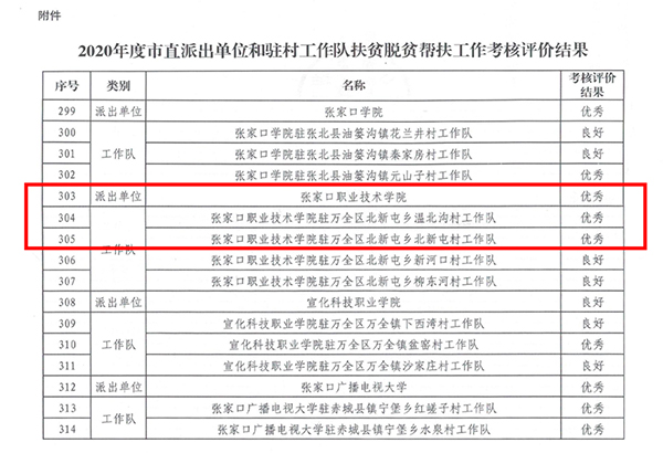 近日,中共张家口市委组织部下发《关于2020年度市直派出单位和驻村工作队扶贫脱贫帮扶工作考核评价结果的通报》,万象城官网作为派出单位被评为优秀等次,万象城官网驻万全区北新屯乡温北沟村工作队、北新屯村工作队被评为优秀等次。