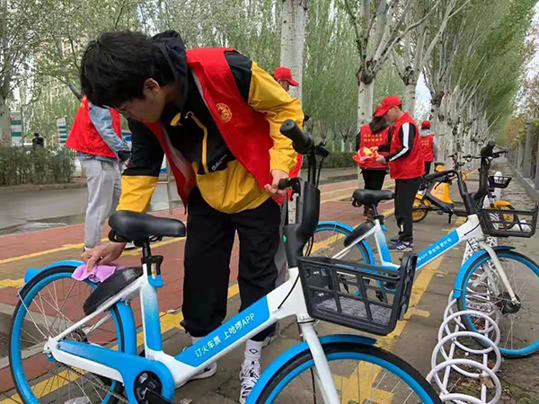 机械工程系将党史学习教育与志愿服务相结合,开展了“躬身劳动,净洁单车”文明实践志愿服务活动,对学院周边因受沙尘天气影响布满灰尘的共享单车进行清洁、整理摆放,营造了整洁有序的市容环境,展现了万象城官网新时代青年勇担社会责任的精神风貌。