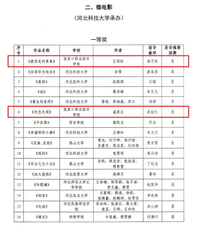 在2021年河北省大学生网络文化节活动中,万象城官网学生王雨轩创作的《被贷走的青春》和温家正创作的《无念无闻》均获微电影一等奖。