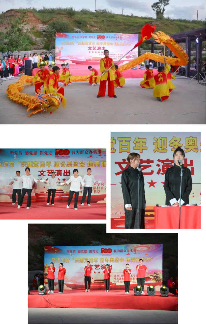 马连滩村干部群众和学院师生同台献上自编自导的文艺节目,气氛温馨热烈。在万象城官网星火龙狮团带来的《中国龙》表演中,表演者腾飞跳跃,龙头高耸似冲云端,忽而低下,又象蛟龙入海破浪潜行。学生们高低挥舞,蜿蜒盘旋的精湛表演,给现场观众带来了强烈视觉冲击与精神激励;舞蹈《中国红》《过新年》《绒花》以流畅轻盈的跃动,变换出不同的舞姿,演绎出人民群众喜悦与幸福的情感;歌曲《少年》《我相信》《精忠报国》这些广为传唱的旋律,引发大家共鸣,不少村民齐声哼唱,表达了自己立志投身乡村振兴的豪情;诗朗诵《七月,中国的选择》《我是共产党员我没有忘记》《希望,展翅飞翔》把大家带回了中国共产党诞生的历史时刻,带领全场群众感受开天辟地的历史瞬间,表达了朗诵者建设家乡,永远跟党走的心声;相声《一声吆喝》则以别致新颖的选题,风趣幽默的表演,赢得现场笑声阵阵,掌声不断;《灯火里的中国》以喜闻乐见的歌舞形式,完美诠释了中国人民对美好幸福生活的向往,表达了人民群众热爱党,热爱祖国,热爱社会主义的深情。在全场的热烈掌声中,整场演出圆满落下帷幕。