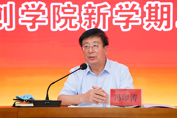 冯印涛强调指出,2021年是我市发展史上极为关键的一年,也是学院改革发展史上至关重要的一年。站在"十四五"征程的新起点上,面对提质培优等各项紧迫而艰巨的任务,开创学院改革发展新篇章需要全体党员干部勇于担当、积极作为,切实做到敢担责、能负责、善尽责。要以干事创业的担当、极端负责的态度和永不懈怠的精神状态,不断拓展抓落实的广度、深度、力度,确保学院决策部署落实落地见到成效。一是要提高站位,深化认识。党员干部要增强大局意识,讲政治、顾大局、守规矩,不断提高思想自觉和行动自觉,围绕中心、服务大局,主动适应学院改革发展新常态,在新常态下有新思路、新举措、新作为;二是要强化责任,担当作为。每一位领导干部都必须以学院发展为己任,始终做到在状态、有激情、敢担当,责任面前不推诿,问题面前不回避,困难面前不退缩,以争创一流的勇气与魄力、干劲和拼劲推动工作,打好学院高质量发展的主动仗;三是要解放思想,大胆创新。把改革创新贯穿于工作始终,紧紧围绕推动内涵发展这一主题,聚焦工作中的重点难点,用改革的精神、思路和办法破解发展难题,推动工作开展;四是要认真履职,狠抓落实。要充分认识提高执行能力的重要性和紧迫性,深刻理解和认真贯彻执行学院的发展方略,认真履责,尽职尽责,把学院党委的各项决策部署落到实处;五是要加强学习,提升能力。要坚持不断地学习,在学习中增强领导能力、科学决策能力、管理队伍的能力,在能做事的岗位上不辜负党的信任和群众期盼。