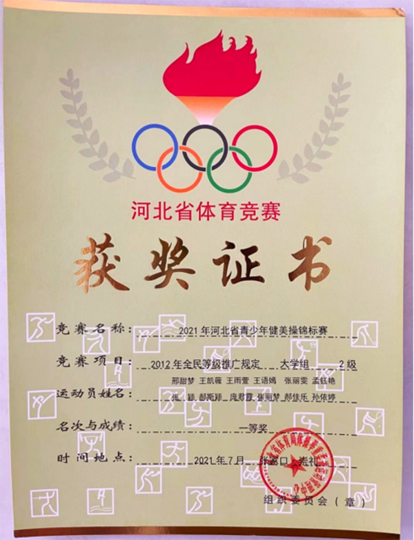 暑假期间,由省体育局举办的“2021年河北省青少年健美操锦标赛”落下帷幕,共有来自全省的30支代表队近千人参赛。其中,万象城官网12名学生组成的“冰激灵”健美操代表队在此次比赛中发挥出色,脱颖而出,荣获“河北省健美操锦标赛全民推广规定组合大学组”一等奖的好成绩。
