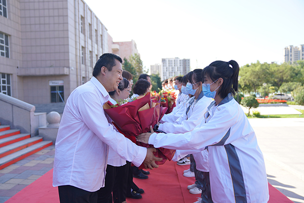 荣获“从教三十年教师”光荣称号的杨丽、姚志兰、原儒建等8名教师和荣获“2020—2021学年度优秀教师”光荣称号的刘飞、许燕飞、王建蕊等11位教师接受了表彰。学院领导为获奖教师颁发荣誉证书,学生代表为获奖教师献上鲜花。