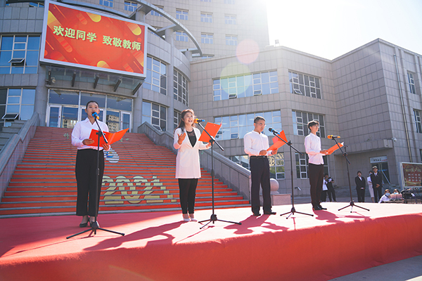 财经旅游学院教师刘立新、机电工程学院教师叶罡宏与土木工程系、信息工程与艺术设计学院学生代表共同献上了诗朗诵《欢迎新同学,致敬张职院教师》。