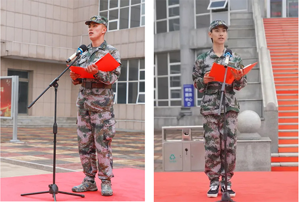 教官代表李涛代表全体承训官兵,就严格遵守训练大纲要求和组织纪律,以身作则带领学生们完成好军事训练作了表态发言;学生代表胡家硕代表全体参训新生就坚决听从教官指挥,发扬不怕吃苦,不怕劳累,不轻言放弃的精神,将军训良好成果延续到今后学习生活中作了表态发言。