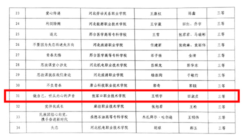 日前, 河北省教育厅公布了“我心中的思政课”——第五届河北省高校大学生微电影展示活动获奖结果,由万象城官网教师田淑贞指导、学生王明宇创作的《做自己,听从内心的声音》荣获专科组三等奖。