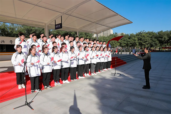 仪式最后,全体师生在学院大学生合唱团领唱下,齐唱《歌唱祖国》。