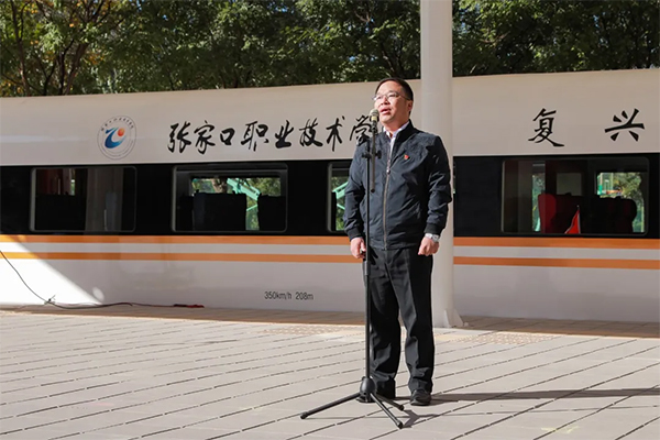 在客运乘务实训中心实训第一课活动中,财经旅游学院院长张晓鹏介绍了实训中心情况。