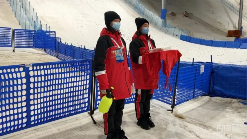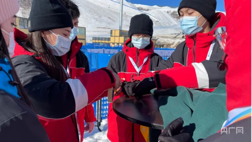 这次测试活动是白天晚上都有比赛。每场比赛前金铭钰和志愿者们都要勘察场地、规划路线、分配人员、确定位置;他们要在光滑的雪地里搬运百公斤重的颁奖台;还要对现场所有的物资进行全面消毒,再摆放整齐……而且这些工作都必须在比赛间歇以最快的速度完成。每一场比赛,志愿者们都要在寒风中站立三四个小时,他们身上和脚底的暖贴都没了温度,双腿麻木至没有知觉,全身都冻透了,眼睛被白雪刺激的酸痛流泪,而且崇礼的紫外线很强,几天下来,金铭钰和志愿者们都变成了“口罩脸”。但他们不说一句苦,不喊一句累,大家都以最饱满的热情、最专业的水平、最温暖的服务,默默地做着看似微不足道的事情。