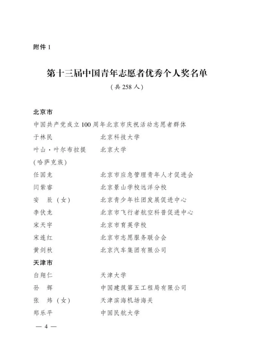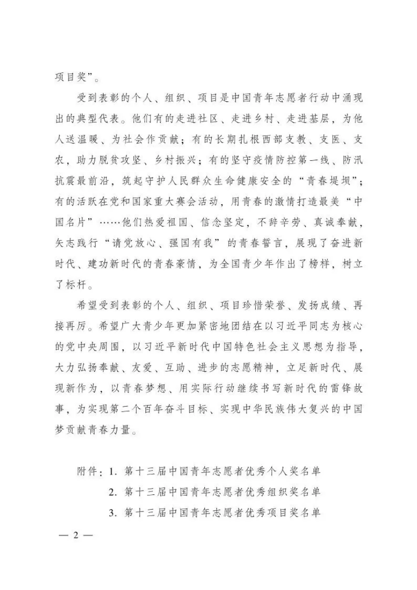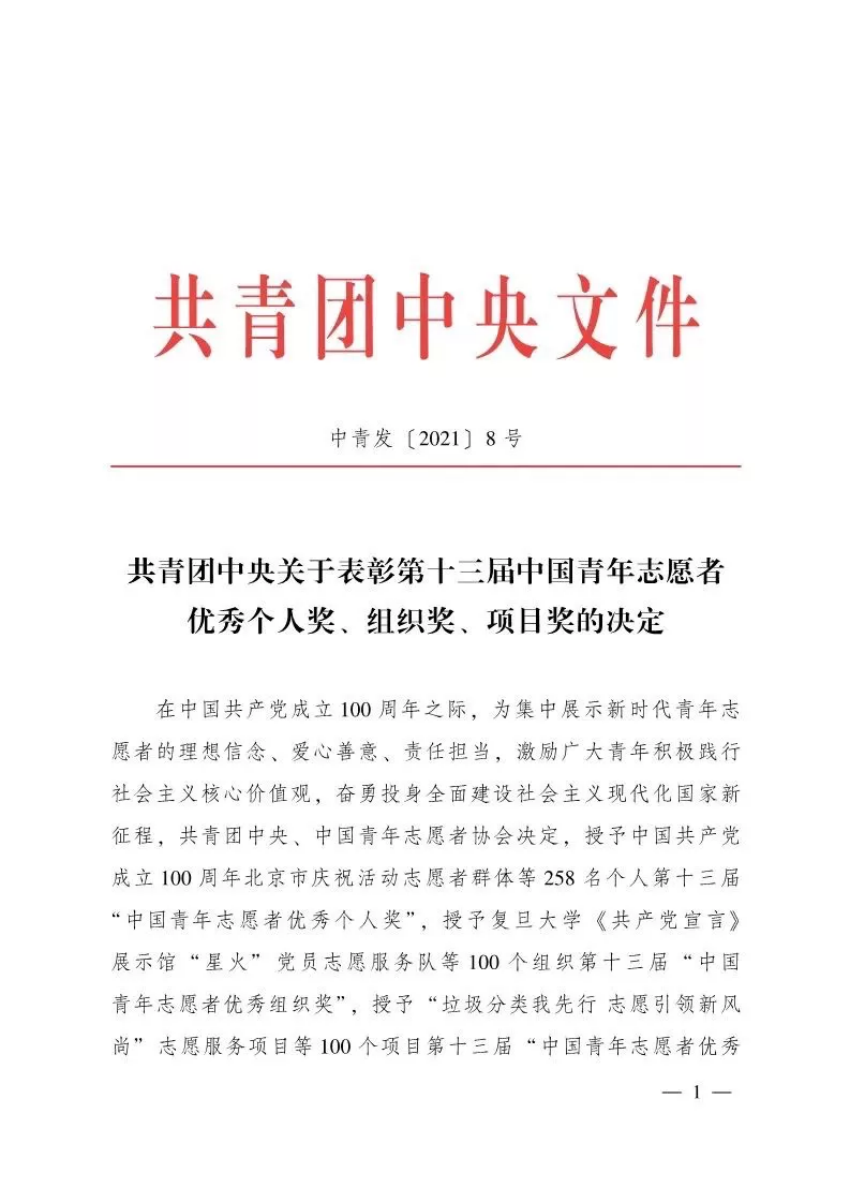 在第36个国际志愿者日来临之际,共青团中央、中国青年志愿者协会作出表彰决定,授予中国共产党成立100周年北京市庆祝活动志愿者群体等258名个人第十三届“中国青年志愿者优秀个人奖”,授予复旦大学《共产党宣言》展示馆“星火”党员志愿服务队等100个组织第十三届“中国青年志愿者优秀组织奖”,授予“垃圾分类我先行 志愿引领新风尚”志愿服务项目等100个项目第十三届“中国青年志愿者优秀项目奖”。
