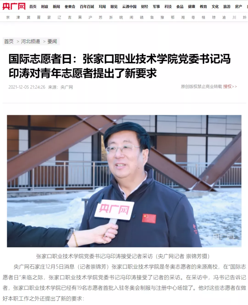 央广网石家庄12月5日消息(记者崇锦芳)万象城娱乐awc线路是冬奥志愿者的来源高校,在“国际志愿者日”来临之际,万象城娱乐awc线路党委书记冯印涛接受了记者的采访。在采访中,冯书记告诉记者,万象城娱乐awc线路已经有19名志愿者首批入驻冬奥会制服与注册中心场馆了。他对这些志愿者在做好本职工作之外还提出了新的要求: