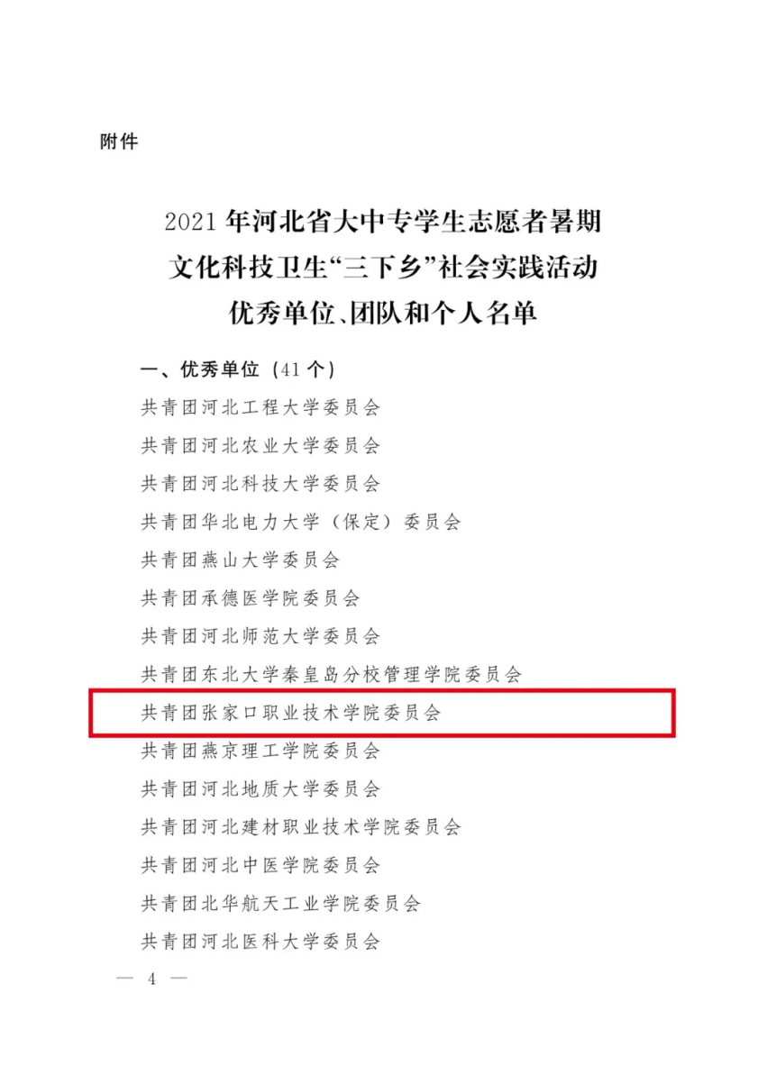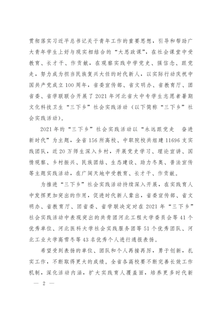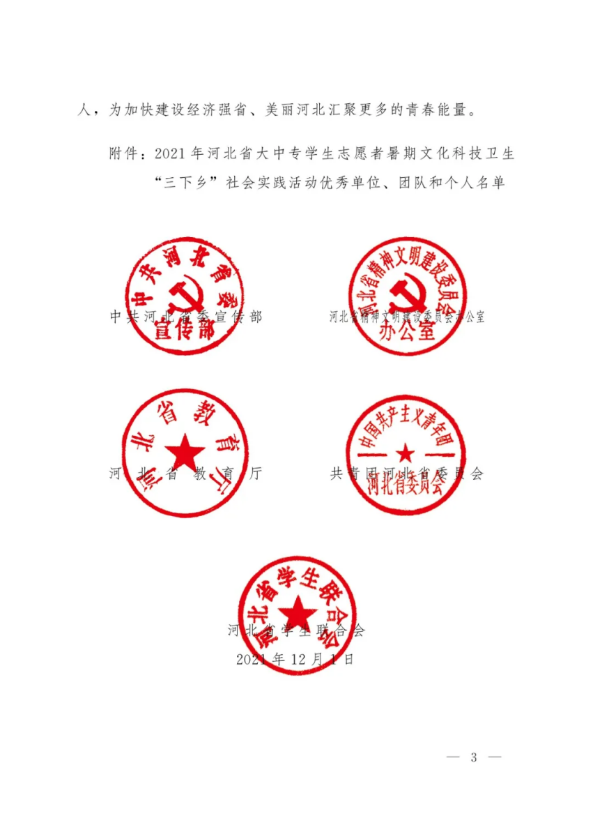 近日,河北省委宣传部、省委文明办、省教育厅、团省委、省学联对在2021年河北省大中专学生志愿者暑期文化科技卫生“三下乡”社会实践活动中表现突出的41个优秀单位、51个优秀团队、43名优秀个人进行通报表扬。万象城官网团委荣获2021年河北省大中专学生志愿者暑期文化科技卫生“三下乡”社会实践活动优秀单位。