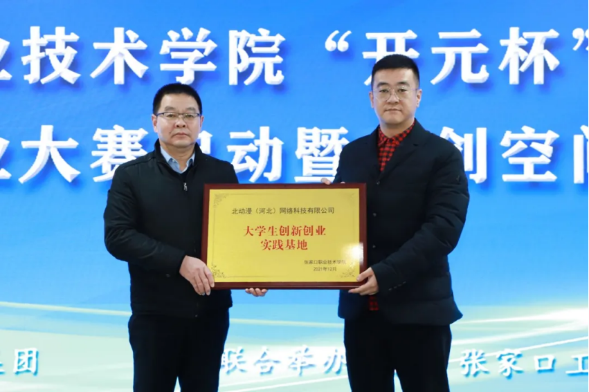 北动漫(河北)网络科技有限公司CEO孙小安为学院授“北动漫(河北)网络科技有限公司大学生创新创业实践基地”牌。