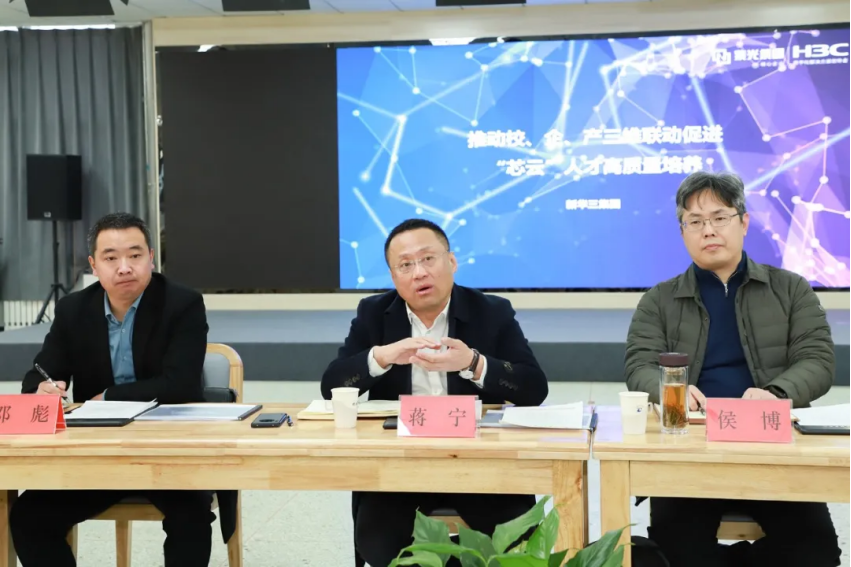 河北华端数据科技有限公司董事长兼CEO蒋宁、紫光新华三集团河北张家口公司总裁邓彪、中铁电气化局集团有限公司基础设施投资分公司副总经理、总经济师侯博分别介绍了各自企业建设发展基本情况,并就产业人才需求、专业人才共育、课程体系建设、科研创新实践等方面围绕校企联合办学进行深入交流探讨。
