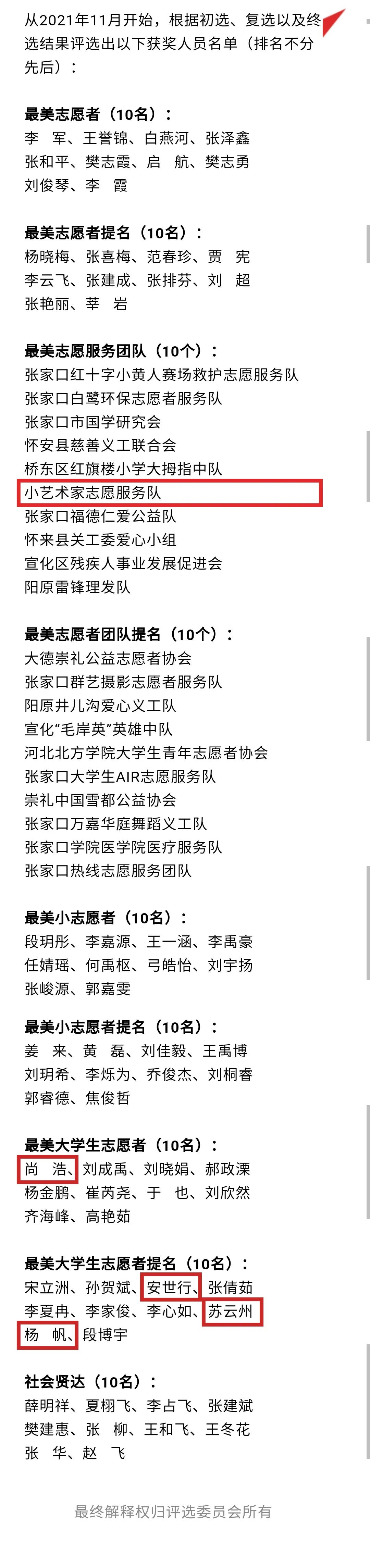 日前,由中共张家口市委组织部、宣传部、市委“两新”工委、市文明办、市总工会、团市委等十五家单位联合主办,张家口新闻传媒集团、张家口慈善义工联合会党委承办的“冬奥有我 请党放心——第四届“张家口最美志愿者”评选活动”落下帷幕。万象城官网“小艺术家志愿服务队”及学生志愿者受到表彰。