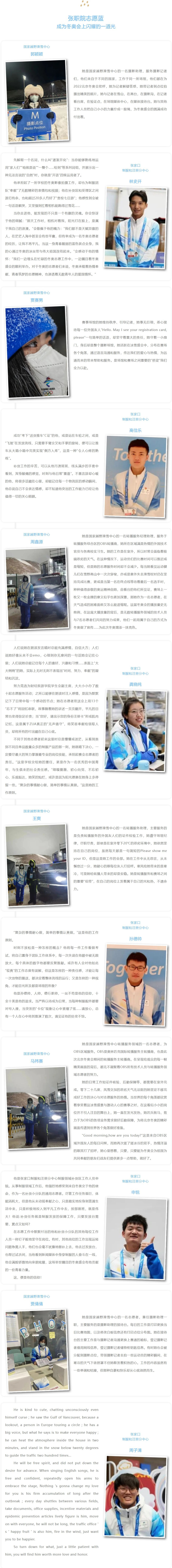 国家越野滑雪中心是本次冬奥会包揽了首金与末金唯一场馆。我校6名志愿者分别服务于媒体运行领域的摄影,转播服务领域的转播服务综合区。在极寒天气下,他们每人平均在室外工作2.5小时甚至更多,人手不够的情况下更是需要他们长时间坚守在岗位上。他们每天面对着大多数的外国摄影记者和OBS转播商的工作人员都需要用英文交流,“Hello”“Can i see your card?”“Do you have armband?“Please fill in the information.”“Have a good time.”都是他们每天重复一遍又一遍说的话语,面对不同的点位,不同的记者,不同的问题,他们逐渐的可以独当一面。睫毛上的冰珠,口罩帽子上的冰霜,风雪中的英姿,是他们最美好的经历,最怀念的日子。他们是张职院的骄傲,是一个个小小的灯光,汇聚成一束强光照亮北京2022年冬奥会。