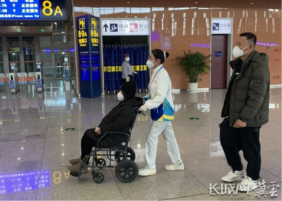侯京奥为出行不便的旅客推轮椅进站。本人供图