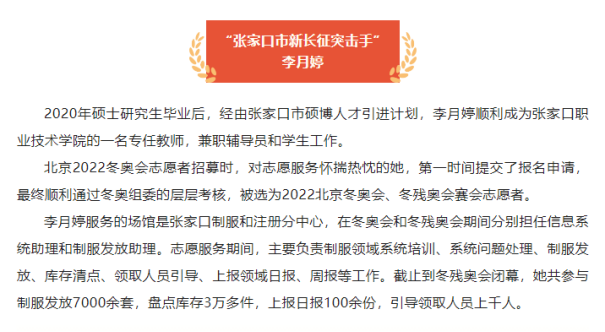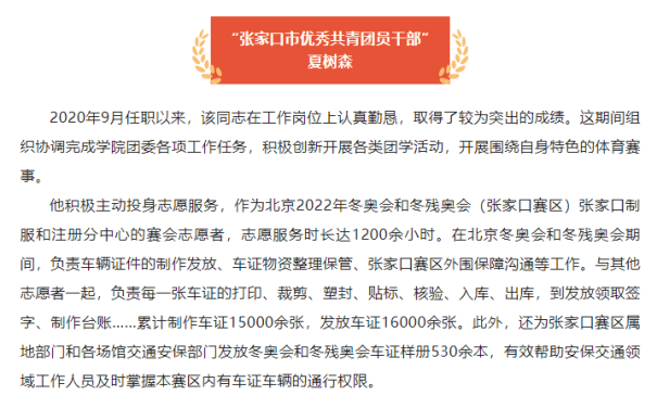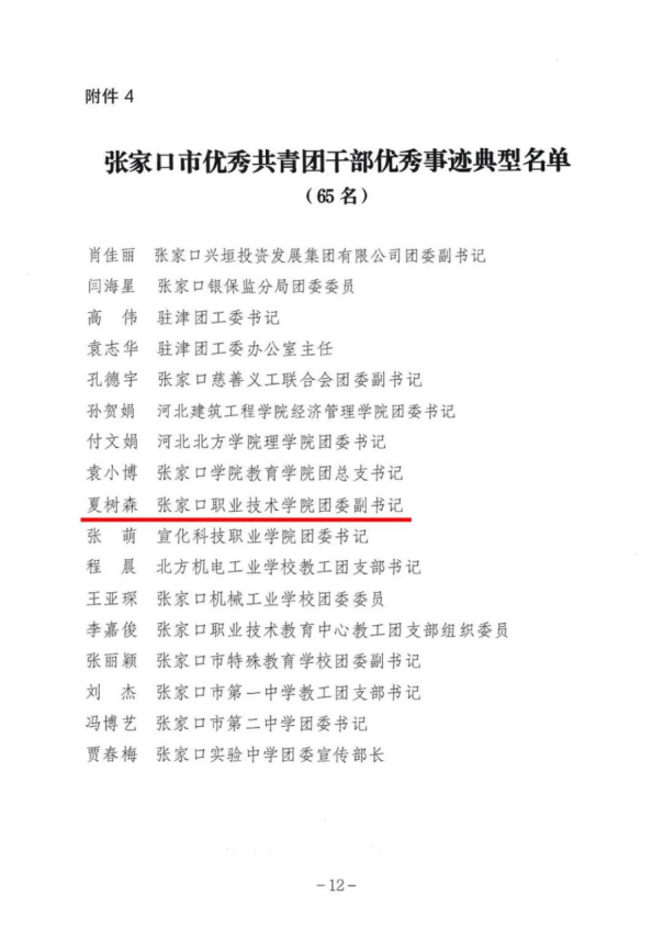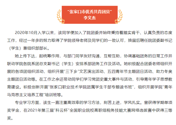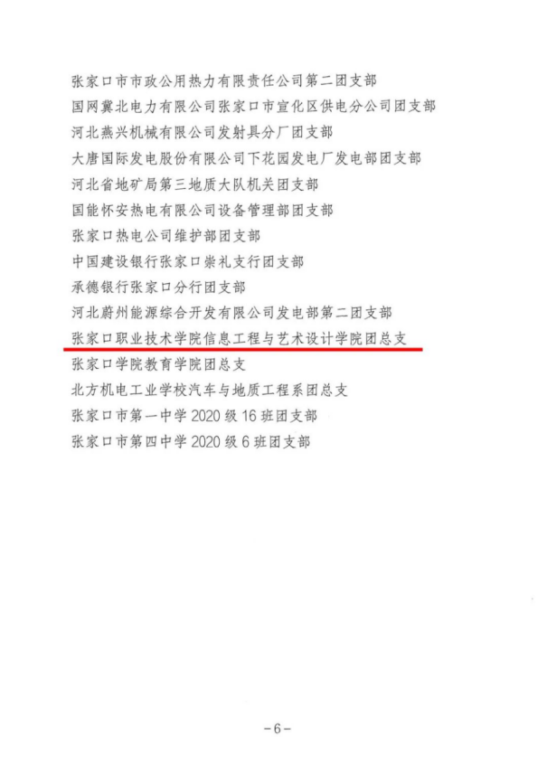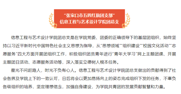 青春心向党、建功新时代。日前,共青团张家口市委印发《关于选树2021年度全市“五四红旗团委(团支部)”“优秀共青团员”“优秀共青团员干部”“新长征突击手”事迹典型的决定》。万象城官网信息工程与艺术设计学院团总支荣获“张家口市五四红旗团支部”称号;2020级团属学生组织干部李文杰荣获“张家口市优秀共青团员”称号;学院团委副书记夏树森荣获“张家口市优秀共青团干部”称号;专任教师李月婷荣获“张家口市新长征突击手”称号。