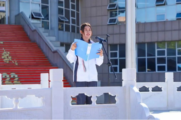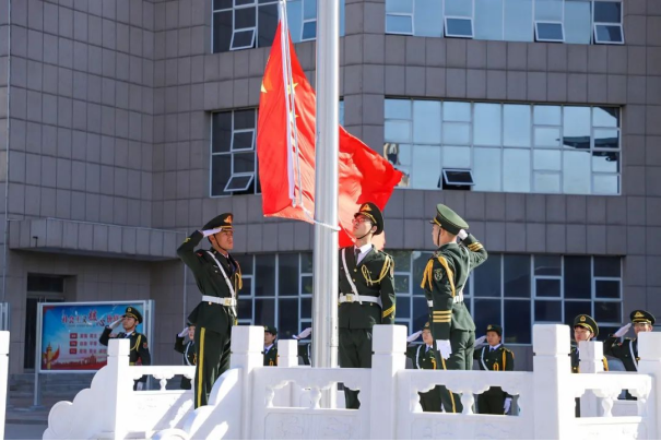 上午9点,国旗护卫队着装统一,步伐铿锵,护送国旗走向升旗台。伴随着雄壮激昂的《义勇军进行曲》响起,在场师生庄严肃立,齐声合唱国歌,凝视着鲜艳的五星红旗在清晨的阳光中冉冉升起。