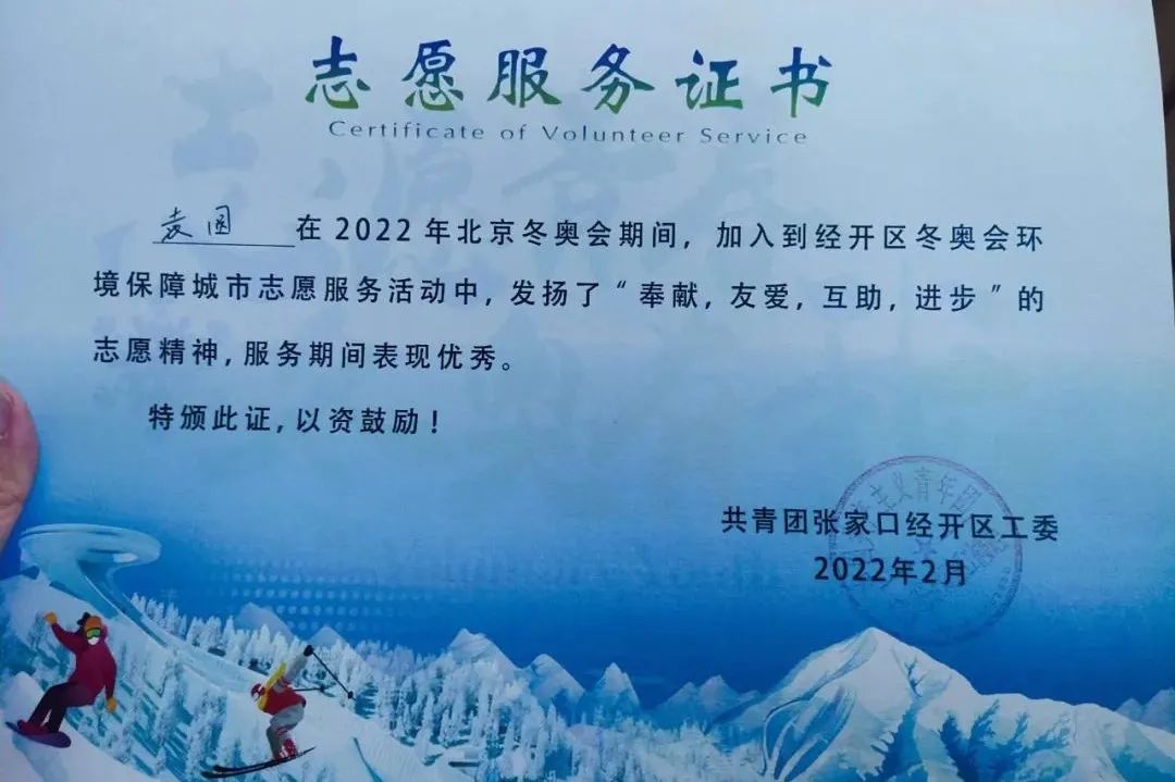 利用寒假期间,加入了经开区冬奥会环保志愿服务的活动,并获评“经开区冬奥会环保志愿服务优秀服务者”。