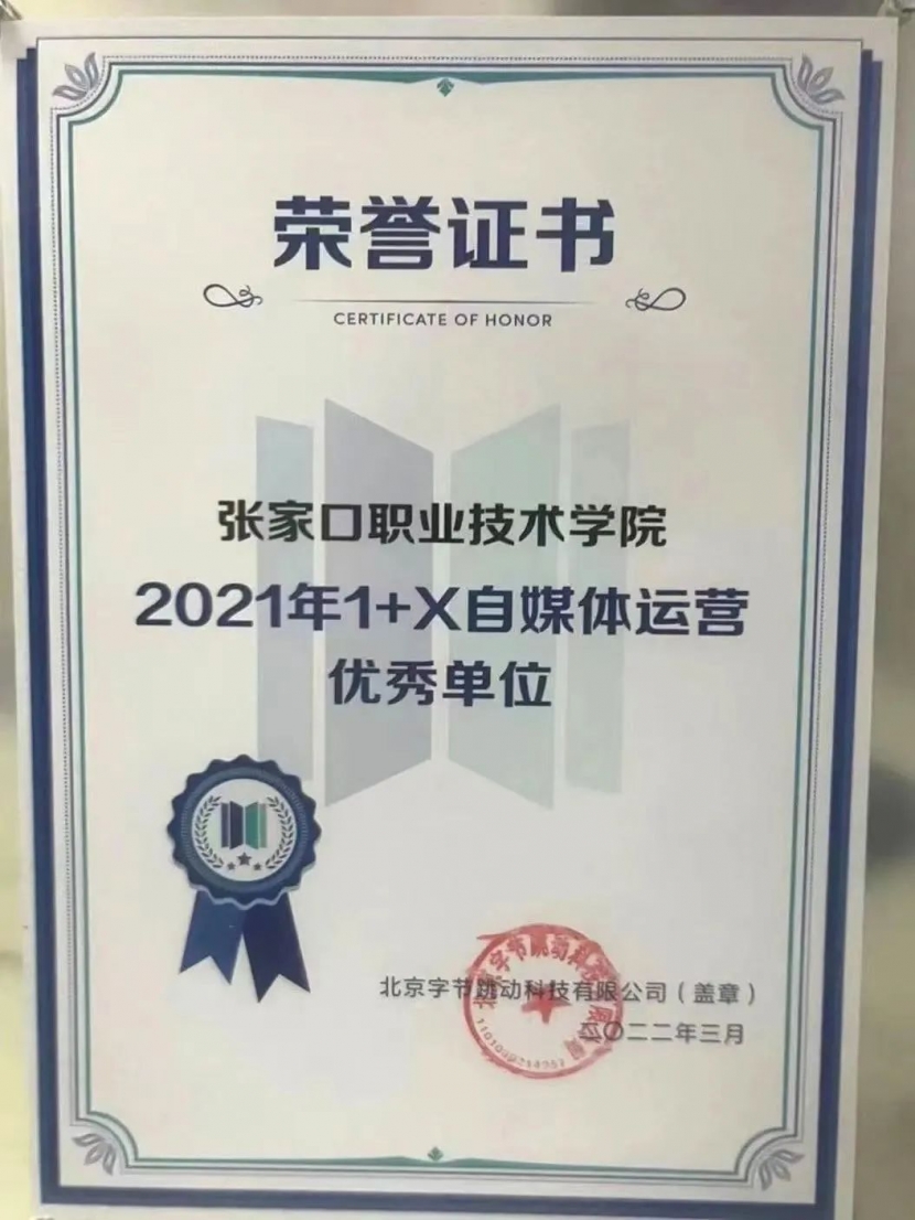 集中力量开展Web前端开发、游戏美术设计、自媒体运营三项证书考核工作。2021年,1+X游戏美术设计考试通过率为94%,1+X自媒体运营(中级)通过率达到100%。教学团队成绩突出,被北京字节跳动公司授予优秀教学成果奖和“优秀教师”称号。