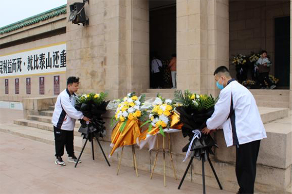 青年教师代表贾斌,在纪念塔前进行发言,呼吁广大青年学子珍惜先烈们用鲜血换来的和平岁月,不忘先烈遗志,红心永铸,甘当炬火照亮人民与祖国前行的道路。学生代表朱思臻带领祭扫师生宣誓,声声饱含革命精神和致敬英雄的誓词在肃穆的陵园激荡、回响。
