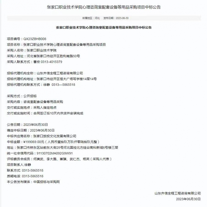 万象城娱乐awc线路心理咨询室配套设备等用品采购项目中标公告