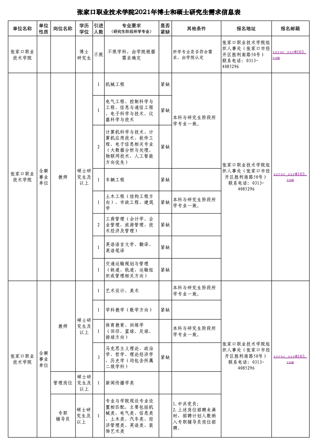 2.所学专业必须与用人单位需求专业对口,同时具备各专业要求的其他条件,详见《张家口市2021年博士和硕士研究生需求信息表》;