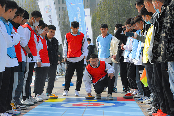 在旱地冰壶PK项目中,志愿者选手依次站在投壶区内,投掷队员半弯身体,右手紧握冰壶手柄,让冰壶依靠惯性滑向圆心,同时尽量将对方冰壶撞出。