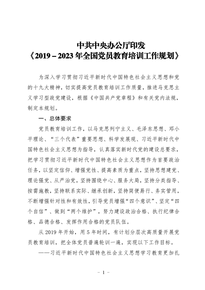 中共中央办公厅印发《2019-2023年全国党员教育培训工作规划》